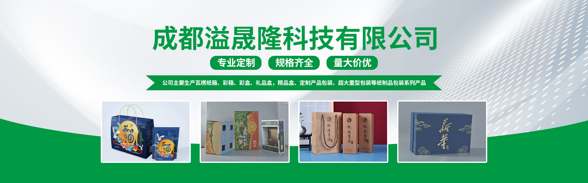 成都溢晟隆科技有限公司成立于2023年3月21日,注册资本500万元,工厂占地面积10000余平方米,是一家专业从事瓦楞纸箱,彩箱、彩盒、精品盒研发、设计、打样、生产为一体的包装智能一体化供应商,公司位于郫都现代工业港园区内,园区内的配套设施完整,地理位置非常优越。 公司主要生产瓦楞纸箱、彩箱、彩盒、礼品盒,精品盒、定制产品包装、超大重型包装等纸制品包装系列产品,公司主要服务于医药、食品饮料、农副产品、电子电器、烟草公司、白酒及化妆品等行业的包装需求,业务覆盖云贵川陕及重庆等各个省区。